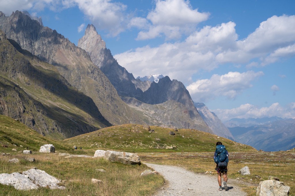 Jagged glacier carved peaks surrounded us and we descended and climbed up to 8000 feet one last time for the day. With tired legs, I climbed in awe. Some of the grandest mountains and glaciers stood before me illuminated with the golden hour light. We were 21 miles in and supposedly with less than two miles left, but soon turned into more than a 25 mile day. We reached the campsite northwest of Courmayeur after 9 PM and spent the next two hours setting up the tent, taking a much needed shower, and cooking two pots of pasta and one pot of rice to fuel our tired bodies. I took control of the communal spork and hungry Luke took out his drivers license and began using it as a utensil. I’d watch his tired eyes look more and more dejected after seeing his pasta slide off his license before reaching his mouth, however, it seemed to work better with the rice. After 25.6 miles with 9800 feet of climbing, we finally had a chance to rest.