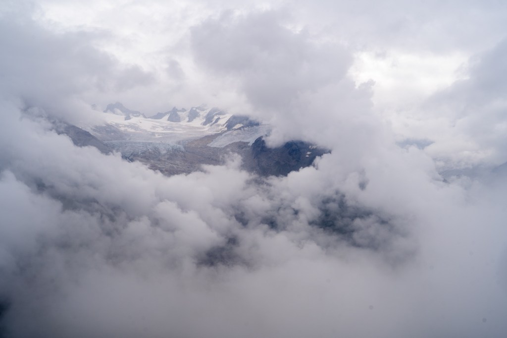 I woke up hungry and soon realized we were almost out of food, just down to emergency rations. One small container of ramen and a questionable (and overpriced) chicken teryaki sandwich from Champex-Lac. We had planned to buy more food at the campsite reception desk, but a quick reconnaissance mission brought Luke back giggling. They were closed. No food and many miles to walk. Luke found it quite funny. The only other restaurant was also closed, so we began walking. We made it up the three mile, 3000 foot climb in an hour and 20 minutes and decided that the €17 chili at the refuge was too much, so we kept hiking with no food. We moved along the ridge, surrounded by clouds, which slowly gave way to glacial views through frames of fog.
