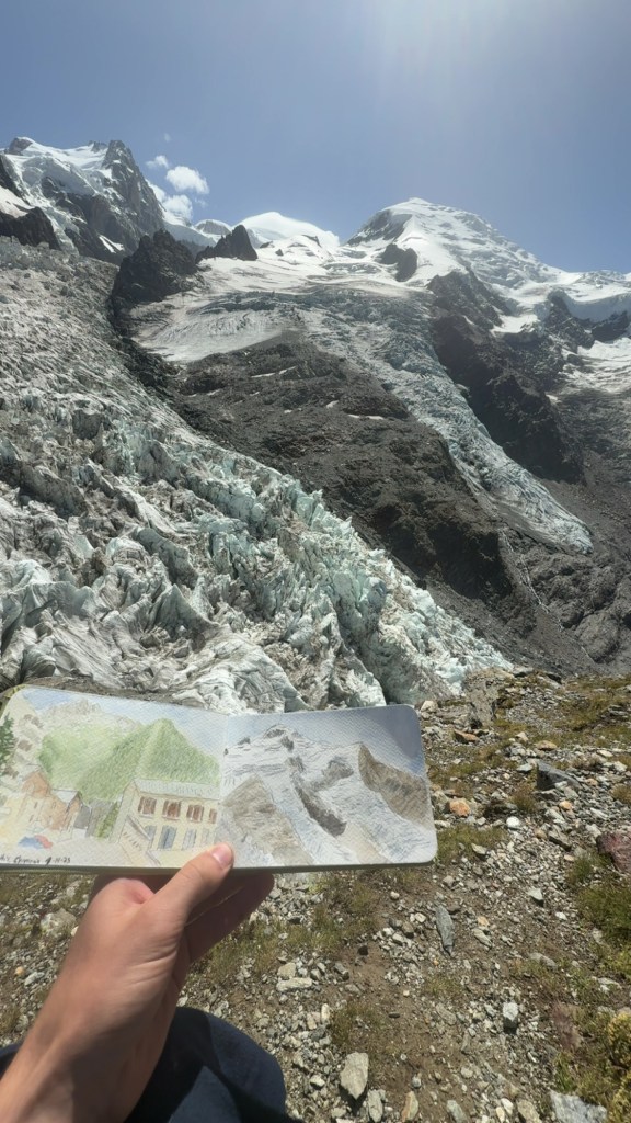 We woke up on our first morning to clear skies and fresh legs. Our objective of the day: La Jonction. A 14 mile round trip hike/run with 6000+ feet of elevation gain to a rocky peninsula surrounded on three sides by glaciers flowing off of Mont Blanc. The first 2.5 miles were along the Arve river through the Chamonix Valley to Les Bossons, before turning and heading up the trail. The next few miles were filled with never ending switchbacks through thick pine forest until it eventually brought us up and into the grassy alpine. At 8400 feet, we topped out, surrounded by blue cracking glaciers. Towering above us, le Aiguille du Midi and Mont Blanc made us feel small and mesmerized. I took out my sketchbook and painted the view, followed by a long 5000 foot descent that left my legs missing home. We returned to our friend’s house in Chamonix, completely exhausted from the run and spent the rest of the evening planning and shopping for the Tour du Mont Blanc over the next week!