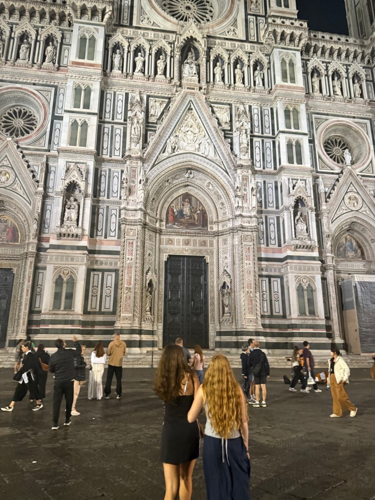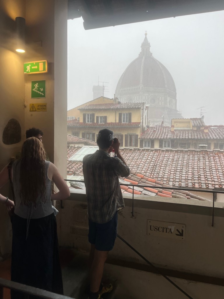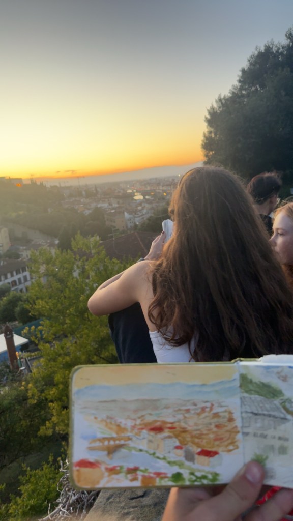 At 4:30, we learned all about the history of Florence from a walking tour which consisted of many petty rulers, impressive sculptures, and good restaurants. We then walked to the plaza on the hill for sunset. We weren’t the only ones with this idea. Every spot with a view of the city was taken and reserved for sunset. We found a quieter spot with a good view and sat along a stone wall. Anika and I did a watercolor painting while Willa journaled and rested. It was cool to paint as the view already looked like a renaissance painting. So my painting was sort of a meta painting, just not quite as detailed. The golden hour light poured across the green Tuscan hills, over the terracotta roofs, and onto the pastel yellow buildings. Florence is full of color.