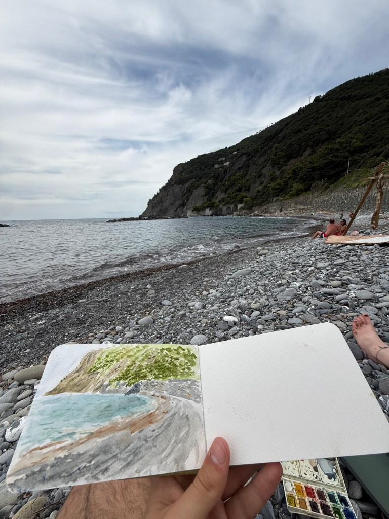 Salt in my eyes, but I am content. On the Tuscan coast, sage green trees and rocky bluffs flow down hillsides to meet the sea. Between these cliffs, where the valley meets the sea, quaint beaches often lie. Grey stones and pebbles streaked with lines of quartz collect warmth from the sun, creating a cozy bed where I now lay. Next to me, my close friends lie asleep. Tired from travel, our mighty swim, and life. Italian pebbles make good beds. Sung to sleep by the power of the ocean, thrashing ever up the bluffs, wanting to follow the path of the trees. The sea cannot travel where the hills go; where we go. Up the hill, the coastal town of Framura is content. Narrow cobble stone paths winding between pastel homes trapped in time. Homes not houses as this place feels well loved and looked after. A cove of paradise. We swam out to the wave breaking rocks, gently moved by turquoise waves. Staying afloat from the salt of the sea, we were rocked into a trance. Up and down and up and down. I watched Anika and Willa disappearing under the peaks and appearing high above the troughs of the waves. Dodging urchins, Willa and I climbed aboard the shore break. We hopped between boulders as the sea calmed itself into the rocks at our feet. Back on land, we painted the flowing sage green trees and bluffs; aquamarine sea and bed of rocks. Painting to be force to look at the details: the sunlight shimmering and highlighting the movement of the sea, the way the water foams as it rides up ever closer to Framura, or the patterns on the drift wood, littered across the cove. With salt in my hair and sun on my back, I am content. The minutes tick by like seconds and I know my train will be leaving the small station soon. How can I ever leave?