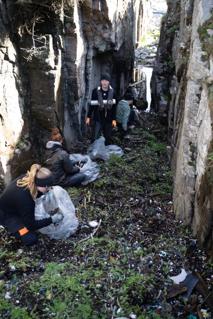 We then returned to the harbor, picked up Rueben and Ida, who work for NMF, and took the boat to Ullnøya, our last cleaning area of the day. We were as far west in the Bergen archipelago as we could reach and the western sea proved empty until the Shetland or Faroe islands. We indulged in a grand picnic, before all falling asleep with full stomachs in the rare sun. My last thought before my eyes fluttered shut was “I’m sprawled out basking like a reptile surrounded by great people on a remote island in Norway. What a life!” The sun was on its way down when we began to clean. The section of island we cleaned worked as a funnel for trash. Large waves from storms surge waves far up into the V-shaped cove and everything gets left for us to pick up. The worst of which was a five-foot wide stone corridor whose floor rose several feet from a terrible mixture of small pieces of plastic with dirt.