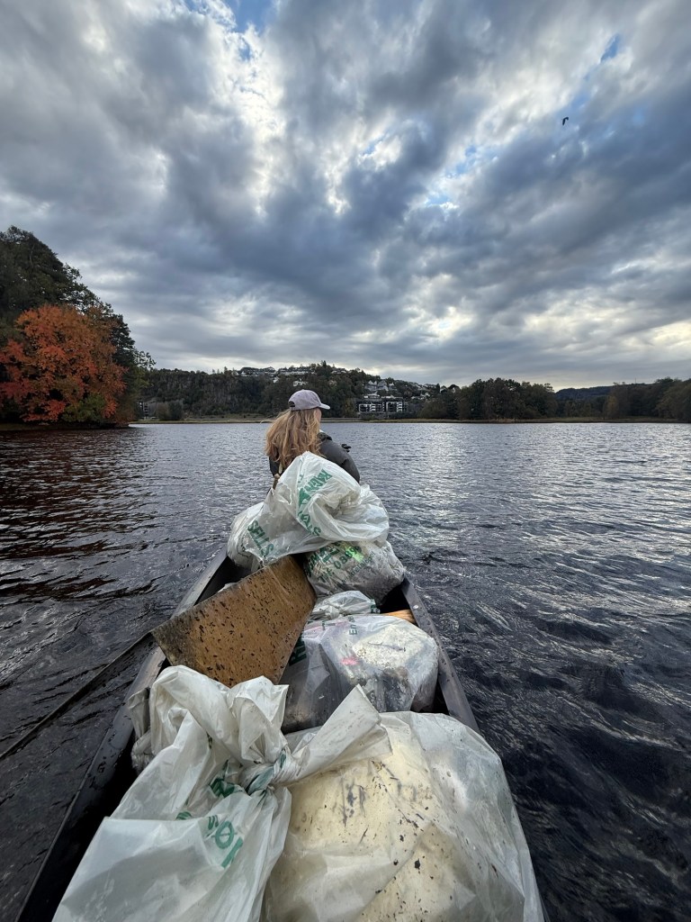 This project was a pilot program or a test for NMF to see how effective river cleaning is. One idea was to use canoes to access trash, so our first day was spent on the lake to hone in on our canoe skills. We first paddled south to where the river narrows. We glided over smooth flowing eelgrass and under more rainbows than volunteers in this project. We then paddled back under the bridge, past Seletun, and made it quite far the other direction before making landfall for lunch. We sat on thick moss and began to understand the strange weather patterns of Western Norway. Rain and sun would come and go interchangeably, often leading to rainbows when the two coincided.