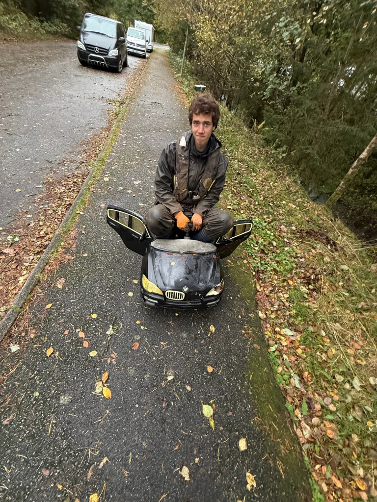Once we regained power, we began where we left off on Haukåselva. Perhaps my favorite find was on October 6th, when Ellie stumbled across a fancy BMW! It was about three feet long, and made of plastic. Ellie and I spent a long time pushing each other down the hill and swerving all around.