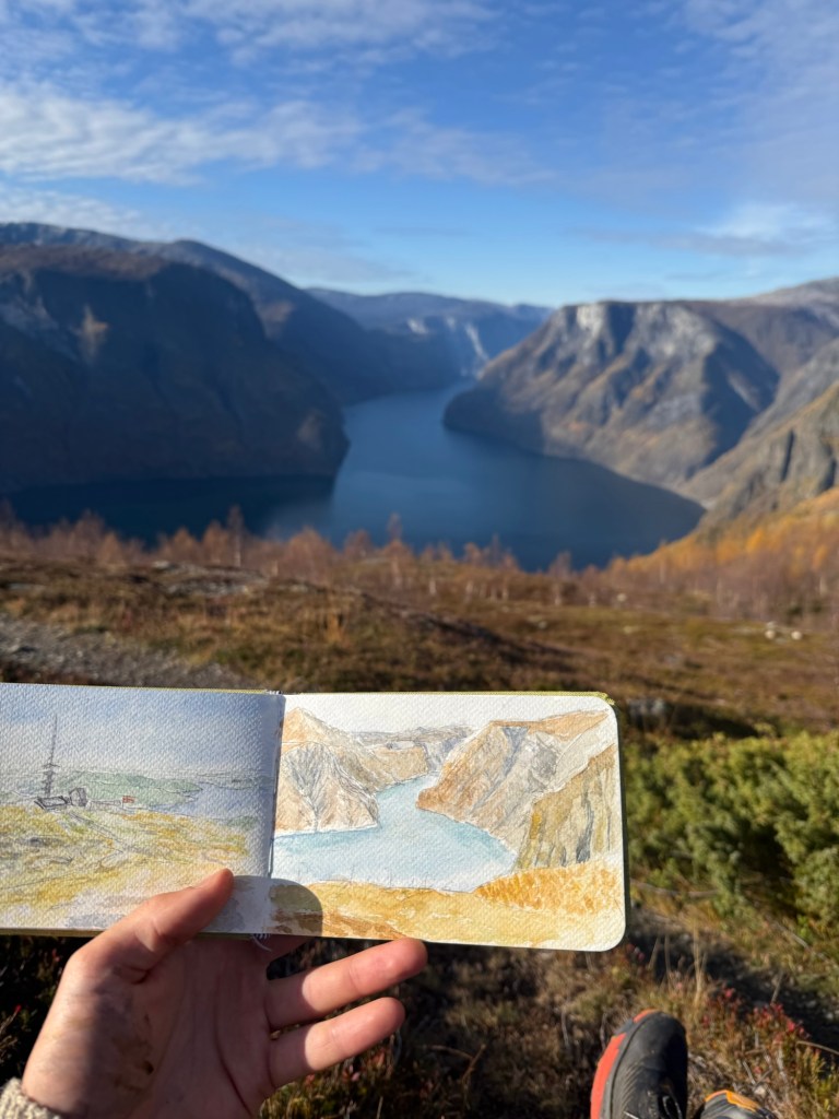 On a rest day in the middle of October, we left Bergen and headed north on a grand adventure. Our drive took twice as long as expected as the a necessary tunnel was closed due to maintenance, so we detoured along the Hardangerfjord. At 1pm, we finally arrived in Flåm, a small, touristy town at the end of Sogneford, the second longest fjord in the world. We hiked high above the water and sat upon the cushy heather. I ate my marmalade sandwiches while painting the view. The deep blue fjord turned and wrapped around the foliage speckled mountains that climbed more the 3000 feet from the sea. The sun came and went and came and went as small clouds moved by. Ferry boats transported below, and churned the calm water and left behind a curtain of waves. Ellie and I went ahead and summited Prest before we all descended. Flåm was magical and autumn is a very pleasant time to explore Norway. A good adventure.